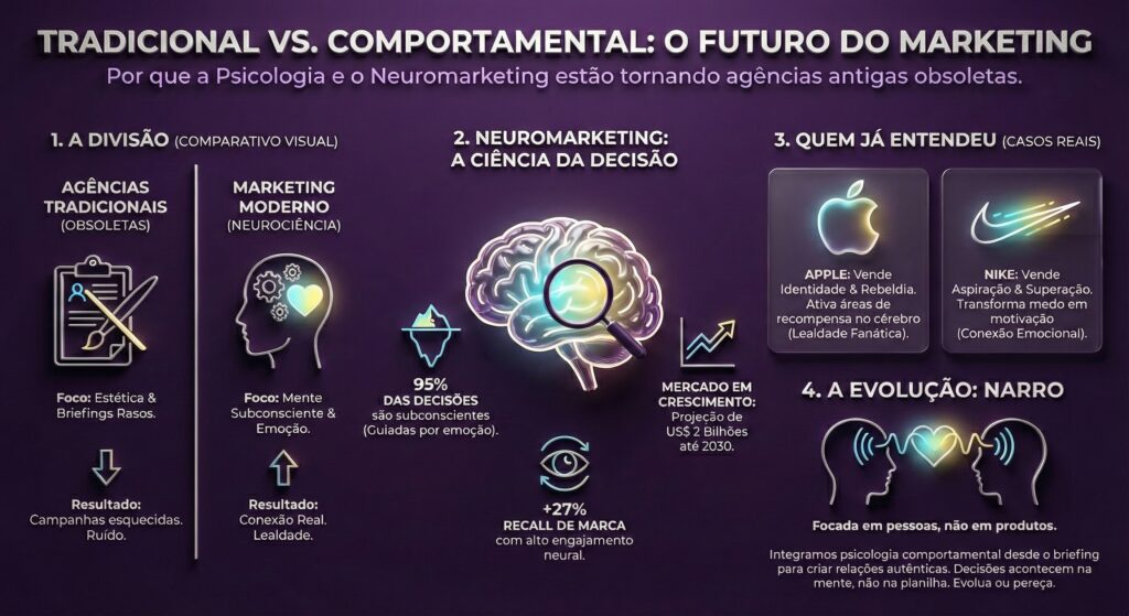 Agências tradicionais, presas a briefings rasos e foco excessivo em design, estão perdendo espaço para as que integram psicologia comportamental e neurociência. Neste artigo, vemos como o neuromarketing revela decisões subconscientes e por que marcas como Apple e Nike dominam ao explorar isso.